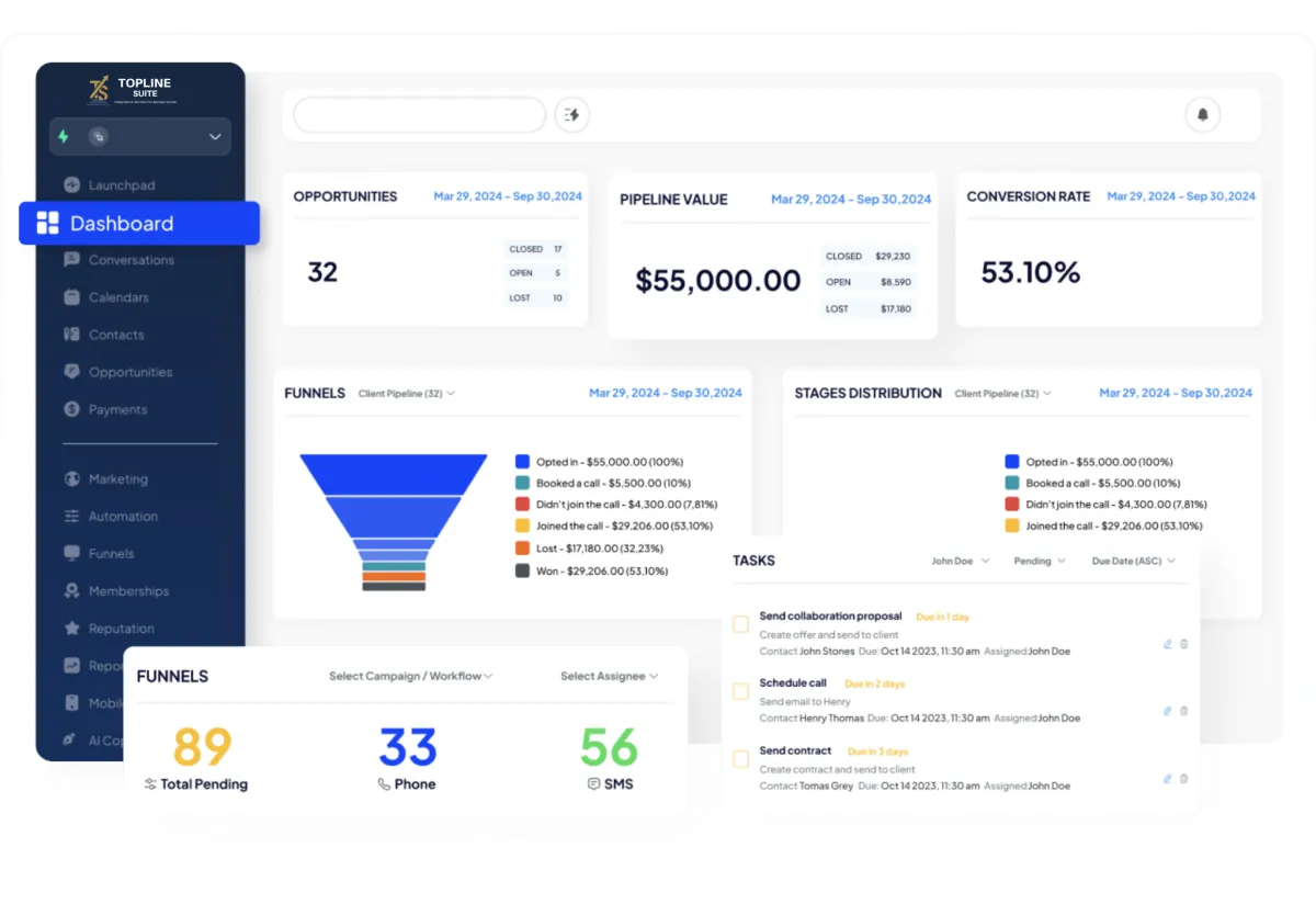 منصة Topline Suite هي أول نظام مبيعات وتسويق متكامل "الكل في واحد" مصمم خصيصاً لعملك. إنها تحل محل أكثر من 10 أدوات مختلفة، وتمنحك تسجيل دخول واحد بسيط لإدارة عملائك، موقعك الإلكتروني، مسارات المبيعات (Funnels)، التقويمات، وجميع اتصالاتك